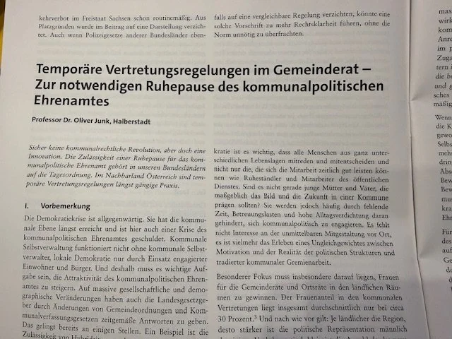 Ich meine: Eine Ruhepause des kommunalpolitischen Mandates muss möglich werden. Dazu habe ich konkrete Vorschläge entwickelt, die in der aktuellen LKV (Landes- und Kommunalverwaltung) veröffentlicht wurden.