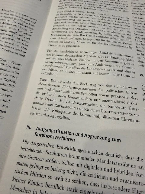 Die Einführung einer gesetzlich geregelten ‚Ruhepause‘ für kommunale Mandatsträger stärkt die Attraktivität des Ehrenamtes, sichert demokratische Mehrheiten und trägt zur Stabilisierung der lokalen Demokratie bei. Die Mandatsruhe ist notwendig, demokratisch sinnvoll und rechtlich regelbar.