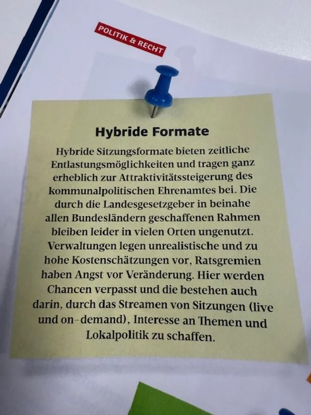 Doch lasst uns zuversichtlich bleiben. An vielen Stellen wurden die Botschaften verstanden. Viele Landesgesetzgeber veränderten und verändern Gemeindeordnungen und Kommunalverfassungsgesetze, um die Attraktivität der kommunalpolitischen Ehrenämter zu erhöhen. Die beinahe flächendeckende Einführung der Möglichkeiten von hybriden Gremiensitzungen ist Beispiel dafür. Auch die Diskussion um temporäre Vertretungsmöglichkeiten kommunaler Mandatsträger bei familiären oder beruflichen Zwängen gewinnt an Kraft.